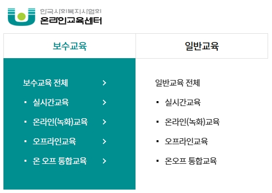 이번시간에는 사회복지사 온라인교육센터 홈페이지(사회복지사온라인교육센터 (welfare.net))에 접속하여 수강신청하는 방법을 알아보도록 할텐데요, 보수교육과 일반교육이 있습니다.
