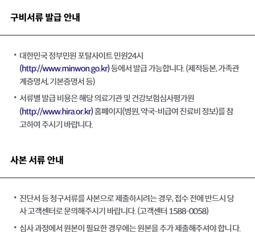 서류별 발급비용은 해당 의료기관 및 건강보험심사평가원 홈페이지를 참고해주시고, 진단서 등 청구서류를 사본으로 제출하시려는 경우에는 접수전에 반드시 고객센터 1588-0058번으로 문의하시기 바랍니다. 심사과정에서 원본이 필요한 경우에는 원본을 추가로 제출하셔야 합니다.