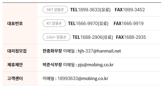 2. 이메일주소 : 대리점모집 hjh-337@hanmail.net, 제휴제안 pjs@mobing.co.kr, 고객센터 18993633@mobing.co.kr