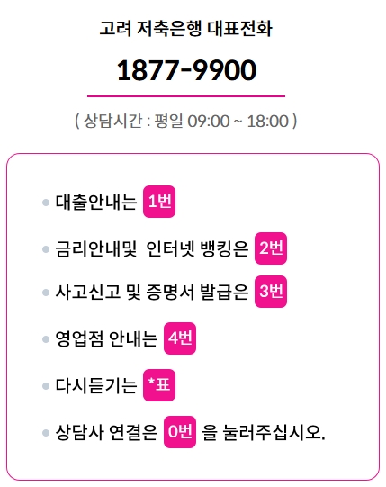 기타 자세한 내용은 고려 저축은행 고객상담센터 1877-9900번으로 문의하시거나 상품설명서를 참조하시기 바랍니다.