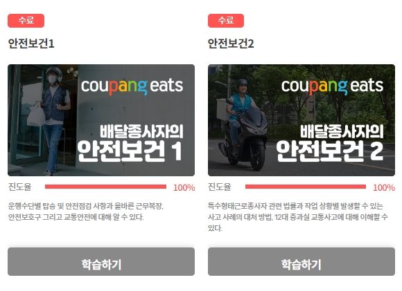 해당 교육을 이수하지 않으실 경우 실제 근무에 제한이 생길 수 있으므로, 쿠팡 관련 업무를 시작하실 분들께서는 사전에 교육을 꼭 완료하시기 바랍니다.