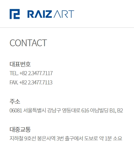 홈페이지(라이즈아트 - RAIZ ART)에 접속하여 온라인으로 만나보시고, 대표번호와 팩스번호 및 회사주소에 대해서는 아래 이미지 내용을 참고하시기 바랍니다.