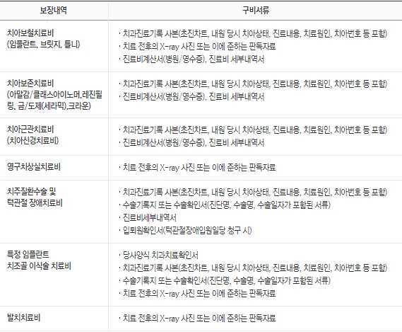 다음은 보장내역에 따른 구비서류를 표로 보겠습니다. 치아보철치료비, 치아보존치료비, 치아근관치료비, 영구치상실치료비, 치주질환수술 및 턱관절 장애치료비, 특정 임플란트 치조골 이식술 치료비, 발치치료비로 구분되어 있으며 각각에 대한 상세 구비서류를 확인해보시기 바랍니다.