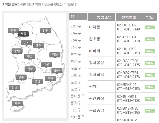 전국 지역이 지도에 표시되어 있는데요, 지역을 클릭하시면 해당지역의 사업소를 찾을 수 있어요. 지역, 영업소명, 전화번호, 약도정보가 있으며 [View] 버튼을 눌러서 세부위치와 상세정보를 확인할 수 있습니다.