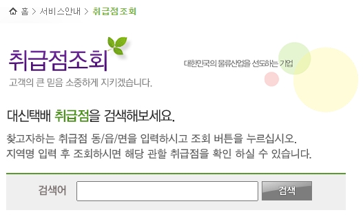 대신택배 취급점을 검색해볼 수 있는데요, 찾고자하는 취급점 동/읍/면을 입력하시고 [조회] 버튼을 누르시면 됩니다. 지역명 입력 후 조회하시면 해당 관할 취급점을 확인할 수 있습니다.