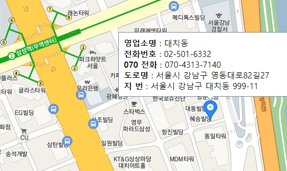 예를들어서 대치동 영업소의 경우 삼성역 근처에 위치하고 있는데요 영업소명, 전화번호, 070전화, 도로명, 지번주소에 대한 정보가 나옵니다. 현재 여러분들이 있는 장소에서 가장 가까운 영업소를 찾아보시구요, 이번시간 글쓰기는 여기서 마무리하도록 하겠습니다.