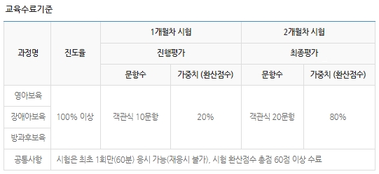 교육수료기준은 영아보육, 장애아보육, 방과후보육 과정에 대하여 진도율, 1개월차 시험, 2개월차 시험으로 구분되어 있습니다. 공통사항을 보시면 시험은 최초 1회만 응시가 가능하고, 시험 환산점수 총점은 60점 이상을 받아야 수료가 가능합니다.