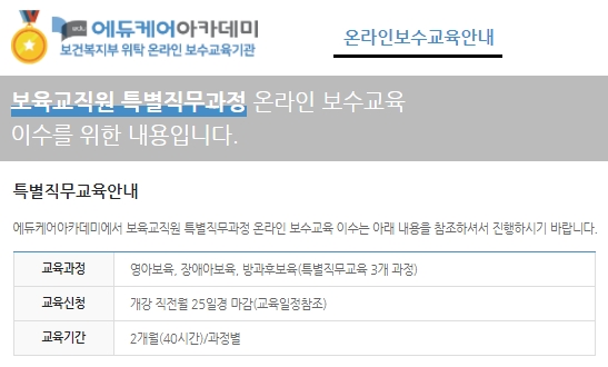 보건복지부 위탁 온라인 보수교육기관인 에듀케어 아카데미 홈페이지에서 확인할 수 있는 온라인보수교육 및 특별직무교육에 대한 안내를 보도록 하겠습니다. 보육교직원 특별직무과정 온라인 보수교육 이수를 위한 내용을 확인할 수 있으며, 교육과정과 교육신청 및 교육기간을 보겠습니다.