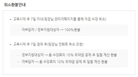 교육시작 후 7일아내에 원장님 관리자페이지를 통하여 직접 수강취소를 할 수 있고, 100% 환불받을 수 있습니다. 교육시작 후 7일 경과 후부터는 원장님 전화로 취소요청을 할 수 있습니다. 정부지원대상자는 총 수강료의 10% 위약금을 공제하고 일할 계산 환불되고, 자부담자는 총 수강료의 10% 위약금 공제 후 일할 계산 환불됩니다.