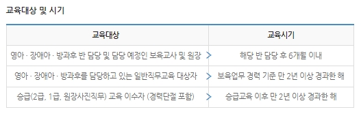 영아, 장애아, 방과후 반 담당 및 담당 예정인 보육교사 및 원장의 교육시기는 해당 반 담당 후 6개월 이내입니다. 영아, 장애아, 방과후를 담당하고 있는 일반직무교육 대상자의 교육시기는 보육업무 경력 기준으로 만 2년 이상 경과한 해입니다.