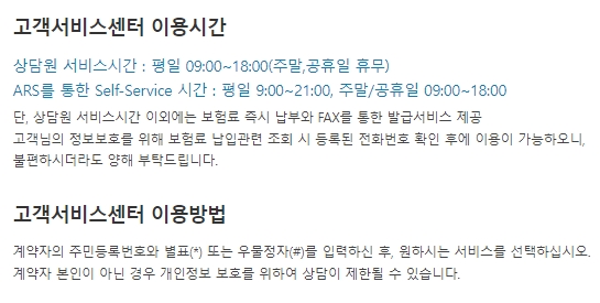 계약자 본인이 아닌경우 개인정보 보호를 위해서 상담이 제한될 수 있습니다. 장애인을 위한 서비스도 제공하는데요, 전화상담이 불편한 고객을 위하여 챗봇과 게시판 및 FAX상담 서비스를 제공합니다.